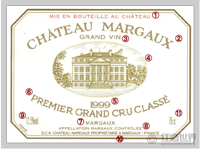 那么,法国葡萄酒酒标表述上述信息的方式是怎样的呢?以下就以1999年玛歌酒庄红葡萄酒(1999 Chateau Margaux)为例,详细分解法国葡萄酒的酒标。