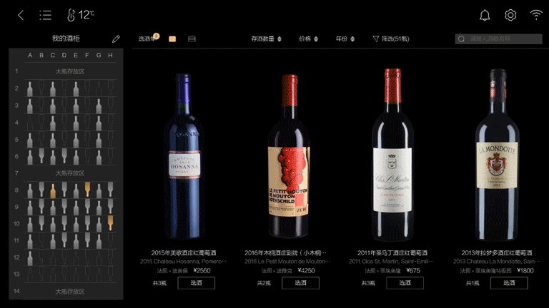 博芬智能酒柜自带智能触摸屏,可以实时显示酒柜内藏酒的数量、酒款图、评分获奖、所属酒庄及酿酒葡萄品种详情等信息,让你对你的藏酒了如指掌。再加上RFID全自动识别酒架的智能识别功能,取酒的时候,只需在屏幕上轻轻一点,就可以实现秒级取酒。
