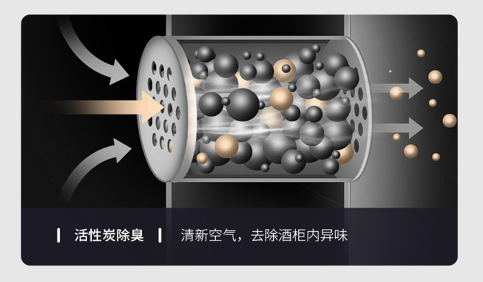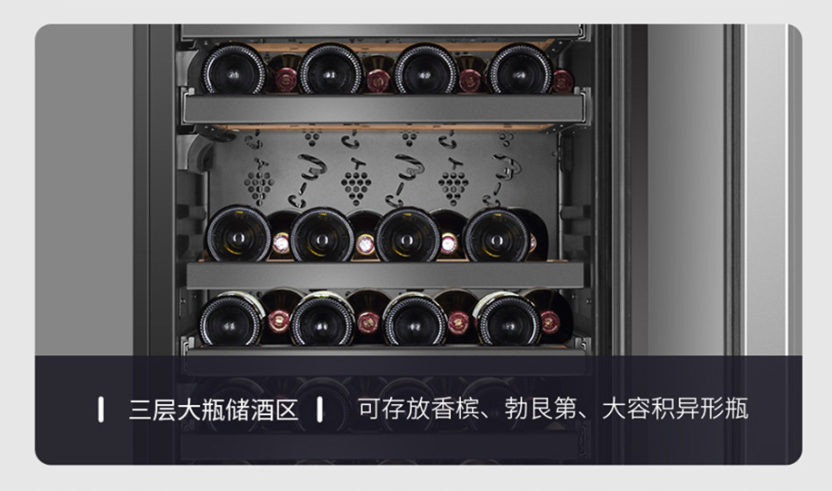 同时,酒柜从外到内细心呵护美酒。外部为钢化玻璃门体,Low-E镀膜玻璃+有色钢化玻璃,提高保温性能,降低紫外线照射,为美酒保驾护航;内部则具备活性炭除臭,让美酒也能“呼吸”清新空气。