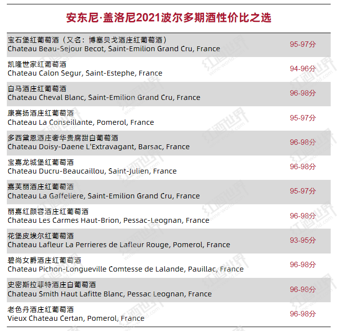 综合葡萄酒的品质、风格和价值的考量,安东尼·盖洛尼精选出了一些他认为非常值得拥有的葡萄酒,其详细名单如下: