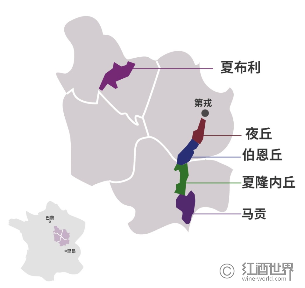 勃艮第共分为5大产区,他们分别是夏布利、夜丘、伯恩丘、夏隆内丘(Cote Chalonnaise)和马贡(Maconnais)。其中,夜丘和伯恩丘又合称为金丘(Cote d’ Or),是勃艮第葡萄酒产区最精华的核心地带。